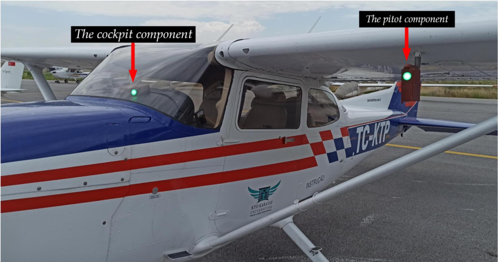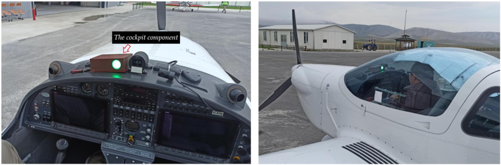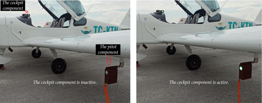 Similar tests were performed on Cessna 172, which had the same Pitot tube diameter. In the tests carried out with the same stages, it was observed that the system also worked successfully on the Cessna 172, and the structural differences of the aircraft did not cause a negative effect on the operation of the system. A picture taken during the tests on Cessna 172 and showing that the system is working properly is shared in Fig. 10. In order to be able to show in the same picture frame that, the power LEDs on both components are lit, the direction of the component placed in the cockpit is turned towards the camera.