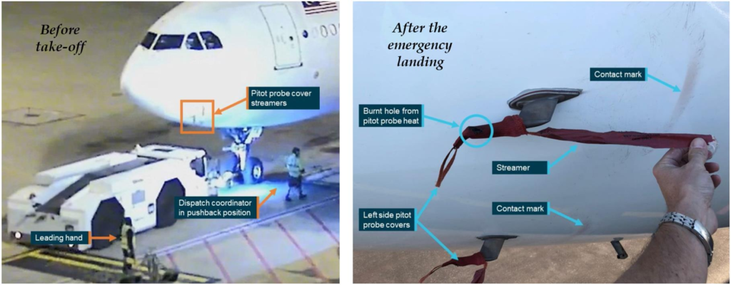 Fig. 3. Images of the Malaysia Airlines plane before and after it took off on 18 July 2018 with the Pitot cover hung up forgotten (ATSB, 2022a). For example, on 18 July 2018, an Airbus A330 aircraft belonging to Malaysia Airlines took off from Brisbane to Kuala Lumpur with all three Pitot covers hung up. When it was understood that the indicators were showing incorrectly, an emergency landing was made at the same airport by taking all risks. This status is shared in full detail in the report published by the Australian Transport Safety Bureau (ATSB) and given in (ATSB, 2022a). Fig. 3 (the view before take-off) shows that the three Pitot covers are still attached while the A330 is being pushed back. The damage caused to the airframe during the flight by the streamers attached to the Pitot covers in this short-term flight, where there was no loss of life, can be easily seen in the image taken immediately after the emergency landing and shared in Fig. 3. However, Pitot tube obstruction is not always so easily overcome. Flight 301, operated by Birgenair on 6 February 1996, with a Boeing 757-225 aircraft with the tail register TC-GEN, ended with an accident shortly after the aircraft took off from Puerto Plata International Airport. All 176 passengers and 13 crew members on board the plane, which crashed 26 km northeast of Puerto Plata, died in this crash. As a result of the research, it was understood that a small creature nested in one of the Pitot tubes of the aircraft, so the speed indicators showed differently, and the autopilot, which took the clogged Pitot tube as a reference, reduced the speed of the aircraft, so the aircraft was exposed to stalls and crashed (Hall, 1996; Ortiz, 1996). Despite these events and the precautions taken, it is known that similar events have been repeated in the recent past. For example, on 27 May 2022, an Airbus A350-941 of Singapore Airlines was to be pushed back to operate flight SQ256 from Brisbane Airport. However, minutes before pushing, it was noticed by a staff member whose job was only to refuel, that the Pitot covers were still attached. Thereupon, a licensed aircraft maintenance engineer (LAME), who should have done this work earlier, removed the Pitot covers one minute before departure time (ATSB, 2022b). When the three examples given are examined, it is possible to experience fatal accidents at any time due to the plane taking off without removing the Pitot cover, or clogging it while parked because the cover is not installed. 2. Literature ReviewAcademic studies conducted to solve the problem defined above were searched in accessible online databases using the keyword “pitot tube”. The studies reached are summarized below. Klopfenstein Jr (1998) presented a comprehensive guide to measuring air velocity and airflow using a Pitot tube. It was emphasized that the Pitot tube and air passages should be calibrated in a wind tunnel. Calibration was carried out using a standard wind tunnel and measurements were made at different flow rates. A computer-aided data acquisition system was designed, the measurement data were processed and calibration factors were applied. The article aimed to provide practical information on Pitot tube-based measurement techniques for field engineers. Dobrowolski, Kabaciński, and Pospolita (2005) presented mathematical models of flow measurement devices such as the self-averaging Pitot tube. Such flow meters were distinguished by their advantages of lower pressure losses in large-diameter pipelines, high-temperature tolerance, and easy installation. In the paper, a model was developed that analyzes the influence of the shape of the flow sensor, its structural features, and flow conditions on the differential pressure. The model was validated by calculating the velocity and pressure fields around and inside the sensor using numerical methods. The study explained the relationship between the Reynolds number and the flow coefficient and presented results applicable to metrology. Sun, Li, and Zheng (2009) investigated the effects of incorrect installation of the Pitot tube on measurement performance. In the study, the impact of installation angles on measurement accuracy were evaluated theoretically and experimentally; correction factors were developed for errors caused by the deflection angle. The findings showed that mistakes can be reduced with correction factors that are symmetrical with horizontal angles and decreasing and increasing with vertical angles. With this method, measurement errors can be reduced to less than 30% even in the case of incorrect installation. Cho et al. (2012) presented a GPS-based calibration method to improve the accuracy of air data systems used in aircraft. The study developed for the smart unmanned aerial vehicle (UAV), a tilt-rotor unmanned aerial vehicle built by the Korea Aerospace Research Institute, addresses the critical challenges in measuring airspeed, barometric altitude, and sideslip angle. Kalman filters and GPS speed information were used to calibrate the errors in static pressure measurements reflected in the airspeed and altitude calculations resulting from the placement of the pitot-static tube in the fuselage. The proposed methods were validated with simulation and real flight data of the smart UAV. Imai, Klockowski, and Varela (2013) presented a method based on error signatures to detect and correct sensor errors in spatiotemporal data streams. Error signatures are defined by mathematical models to identify data inconsistencies. The method was tested on a specific Cessna flight and the 2009 Air France AF447 accident. For the Cessna flight, scenarios, where the Pitot tube (airspeed indicator), GPS, and both failed, were simulated. The error detection accuracy was 93%, and the maximum correction time was 5 seconds. The Pitot tube failure for the AF447 accident was analyzed with real flight data. The error was successfully detected and corrected within 5 seconds. The overall