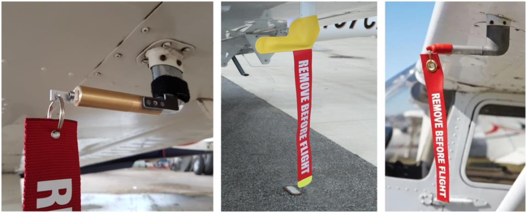 Fig. 2. Examples of pitot cover. As demonstrated in Fig. 1, the pitot tube used to measure the total pressure has an open end facing the flight direction of the aircraft. This hole, which has a very small diameter, must always remain open during the flight. Any blockage here will cause the aforementioned altitude, airspeed, and vertical velocity indicators to show incorrect values. If one of the dynamic or static ports is clogged, the Pitot tubes can overestimate the velocity by up to about 5.6% (Golparvar and Yapici, 2020). In order not to experience such a danger during the flight, there are drain holes and heaters in the pitot tube as demonstrated in Fig. 1. However, clogging of the Pitot tube can also occur when the aircraft is parked. Because dust or sand particles carried by a strong wind can block this hole even when the plane is parked. In addition, since the Pitot tube is warmer at night compared to other environments, it can also be used as a nest by small-sized creatures. Therefore, when the aircraft is parked, the protruding probe of the pitot tube should be covered with appropriate covers. There are pitot covers produced in different ways from many different materials. Fig. 2 shows various pitot covers. In order to prevent these covers from being forgotten during the pre-flight checks, a very striking streamer, flag, or strip, approximately half a meter long, is attached to them. The streamer is also seen in Fig. 2. In the pre-flight checks of the pitot/static system, the following factors are considered (CAE, 2014):