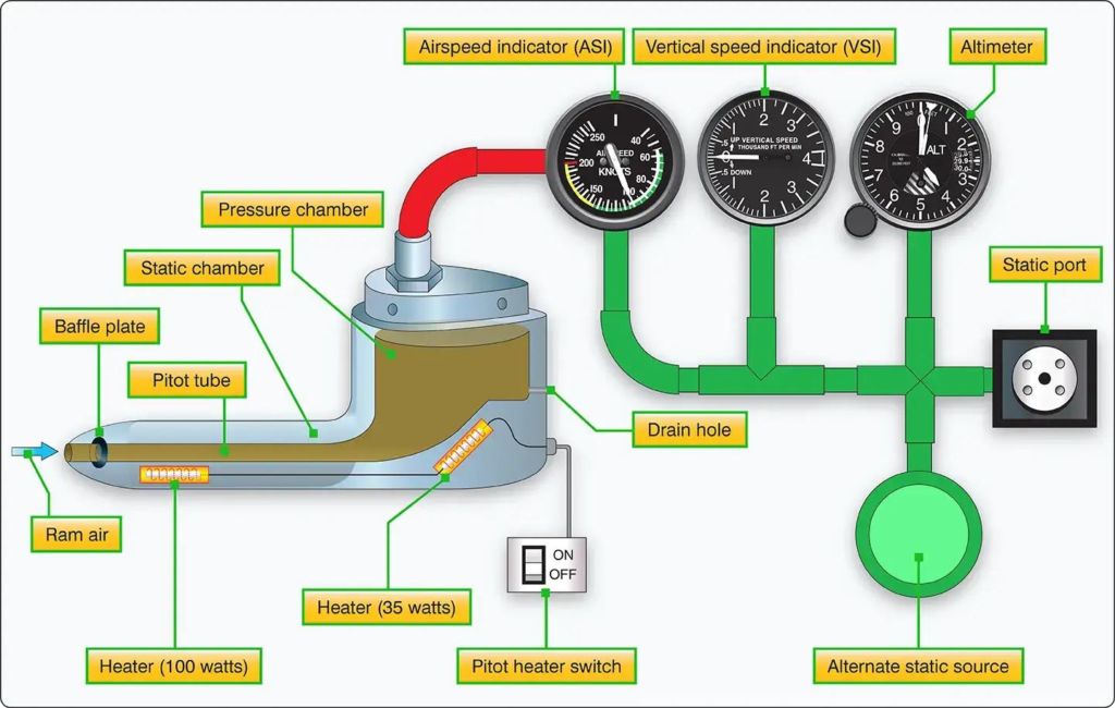 Fig. 1. A typical pitot-static system and the indicators it feeds (Anonymous, 2023).