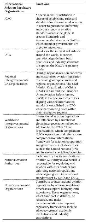 A comprehensive framework of aviation regulations has been instituted to facilitate the orderly conduct of air travel, examining the principal elements of international aviation regulations and emphasizing the functions of significant entities such as the International Civil Aviation Organization (ICAO), the Federal Aviation Administration (FAA), the European Aviation Safety Agency, the International Air Transport Association (IATA), and National Civil Aviation Organizations (NCAO). International aviation regulations are laws and standards developed to regulate several facets of worldwide air transport. These standards guarantee the safety, security, and efficiency of international flights, covering a comprehensive array of operational, technical, and legal stipulations. International entities such as the International Civil Aviation Organization (ICAO), founded under the Chicago Convention of 1944, principally formulate and implement these regulations. The International Civil Aviation Organization (ICAO) advocates for member governments to implement its Standards and Recommended Practices (SARPs) to enhance uniformity and consistency in global aviation safety and operations. International aviation regulations encompass various domains, including aircraft operations, airworthiness, airport infrastructure, pilot certification, air traffic management, and environmental safeguarding. International aviation regulations seek to mitigate risks, prevent accidents, and facilitate uninterrupted air transport across national borders. These regulations also encompass matters such as passenger rights, liability in the event of accidents or incidents, and the legal framework governing international air services agreements between nations. Airlines, airports, and aviation staff must comply with these requirements to uphold uniform safety and security standards. The commencement and proposal process generally commences with the identification of areas for regulation or the revision of existing standards. This could be prompted by technological improvements, safety accidents, environmental concerns, or alterations in global air traffic patterns. Member nations, international entities like the International Civil Aviation Organization (ICAO), or industry stakeholders advocate for new legislation or modifications. The structure of International Aviation Regulations involves a network of organizations and bodies of aviation stakeholders that collaborate to set up and develop standards for safe and effective worldwide air transportation (AnAviationServices, 2024). Different national interests and agendas make it difficult to harmonize international aviation legislation; therefore, nations, international organizations, and industry players must continue to work together to promote a unified regulatory framework. New developments in aviation technology, such as electric airplanes and unmanned aerial vehicles (e-VTOLs, drones), have posed regulatory issues, and the current situation requires the responsible authorities to modify current laws to take these advances into account while maintaining operational integrity and safety.